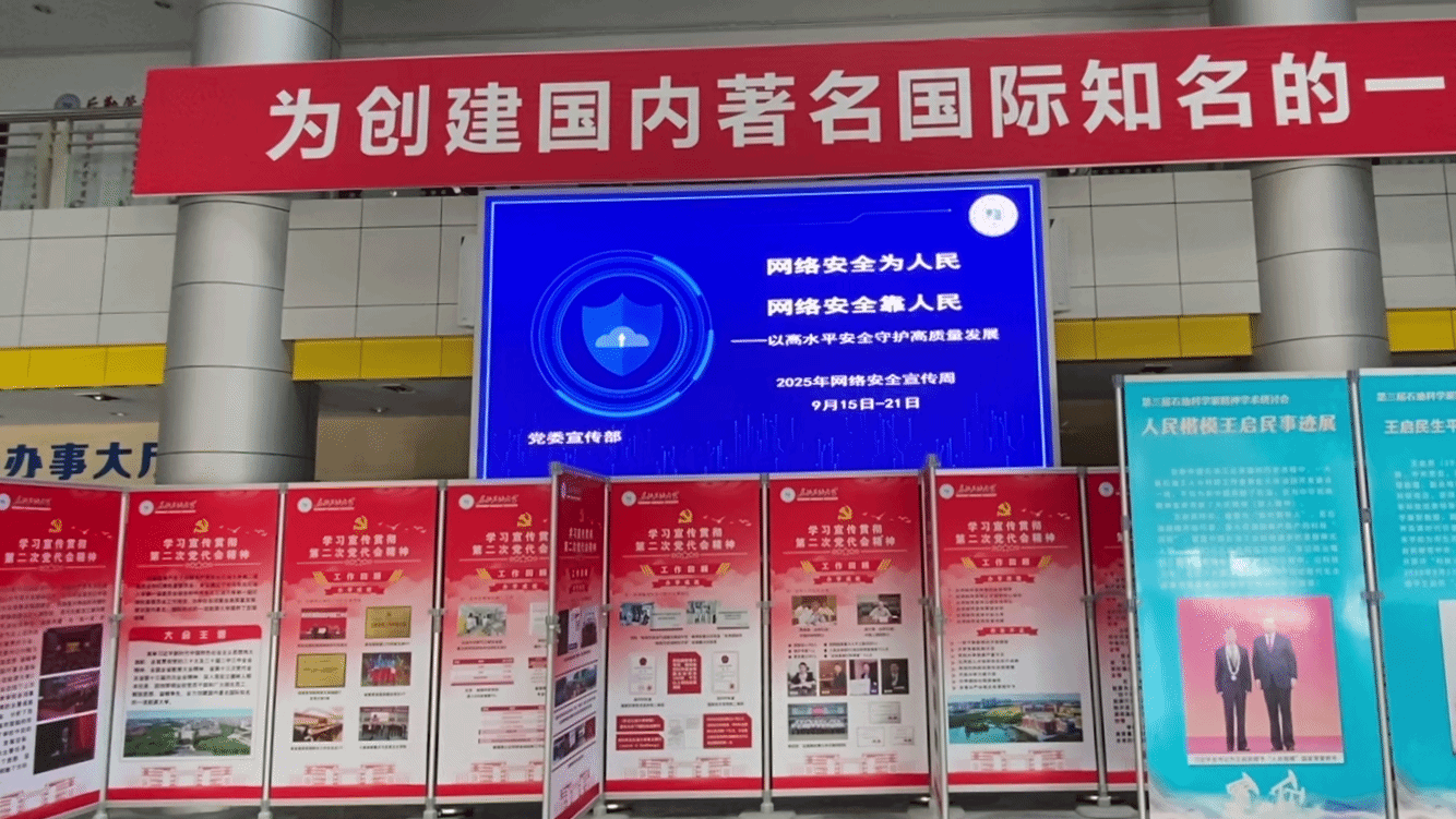 网络无边,安全有界。活动中,我校使用官网大图展示宣传,强化宣传力度;通过网络安全宣传周专题网站,广泛宣传《网络安全法》及国家网络安全成果;通过“东北石油大学”微信公众号等平台,发布网络安全倡议书等内容,从防范网络诈骗、个人信息保护、信息安全保密、人工智能安全等角度,向师生普及网络安全知识,推广网络安全技能。线下通过电子屏幕标语点亮全校楼宇、户外大屏,将网络安全宣传教育材料发放至师生手中,增强了师生的安全意识。
