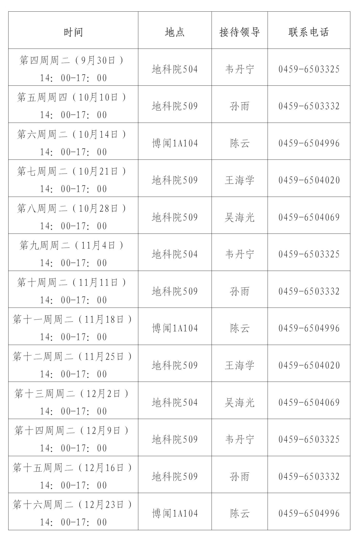 为了更好践行“以师生为中心”的理念,精准把握师生需求,切实解决教学科研及生活中的实际问题,特制定地球科学学院院领导接待日安排计划。详见附表1。