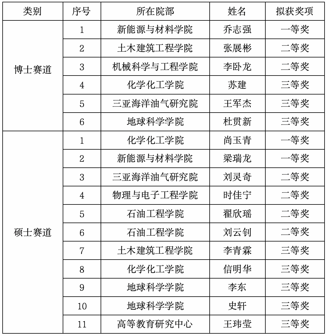 为促进研究生学术交流,营造浓厚的学术氛围,进一步激发研究生的科研创新潜力,提高研究生培养质量,充分展现我校研究生的学术风采,学校组织开展了东北石油大学第四届研究生学术论坛优秀学术报告评选工作。经各分论坛审查推荐及专家评审等环节,确定获奖人员名单如下,现予以公示: