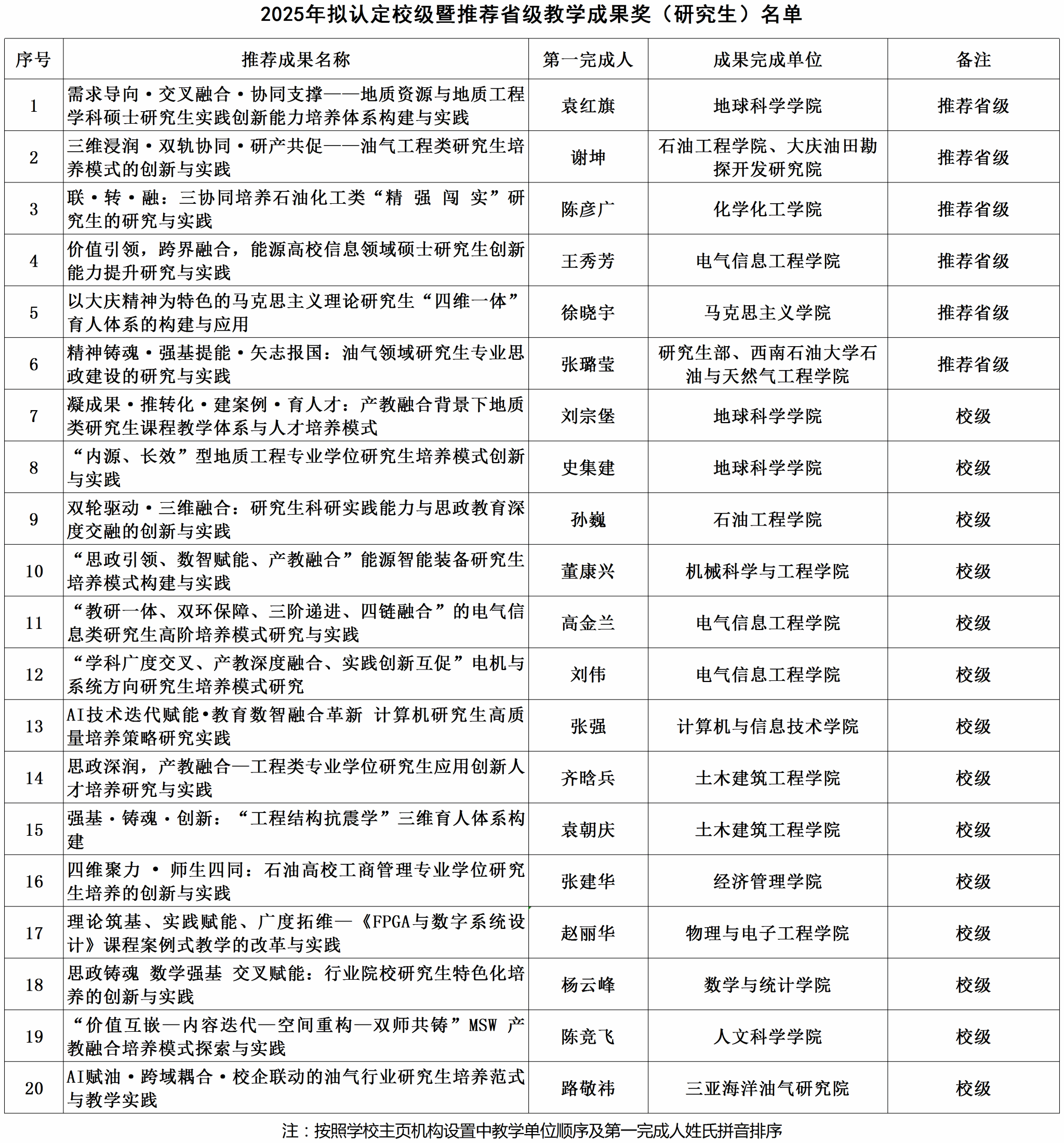 根据省教育厅《关于开展2025年黑龙江省高等教育(本科、研究生)和职业教育教学成果奖评审工作的通知》《东北石油大学高等教育教学成果奖评定及奖励办法》等文件,学校组织了2025年校级教学成果奖(研究生)评选暨省级教学成果奖推荐工作,经过学院推荐、研究生部组织专家评审,现将拟认定校级暨推荐省级教学成果奖(研究生)名单予以公示,公示期11月7日-11月13日(5个工作日)。