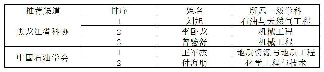 根据《中国科协办公厅关于启动2025 年中国科协青年科技人才培育工程博士生专项计划的通知》《中国石油学会关于开展2025年中国科协青年科技人才培育工程博士生专项计划遴选推荐的通知》及《黑龙江省科协关于开展2025年中国科协青年科技人才培育工程博士生专项计划推荐工作的通知》要求,经过学院上报、学科推荐、学校评选,我校拟推荐刘旭等5人通过黑龙江省科协及中国石油学会参评中国科协青年科技人才培育工程博士生专项计划。