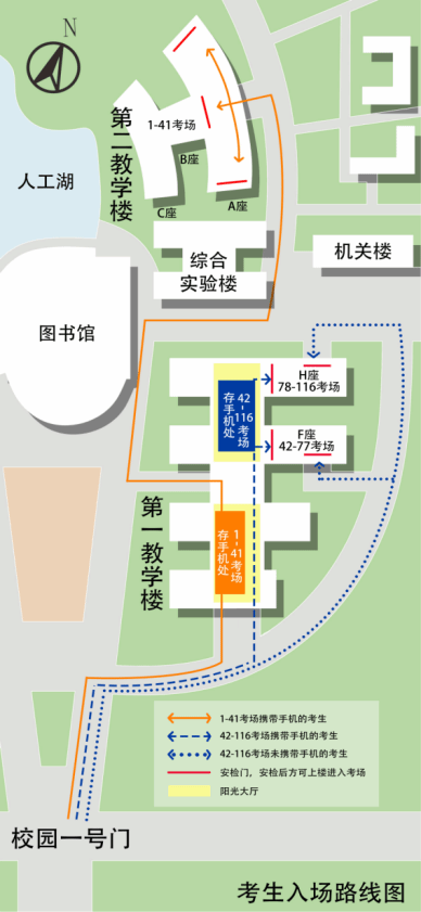 2.考区入口:进入校园后,未携带手机的考生根据入场路线图直接到达相应考区(第一教学楼F座或第一教学楼H座或第二教学楼A座),携带手机的考生根据入场路线图前往手机存放处存放手机。
