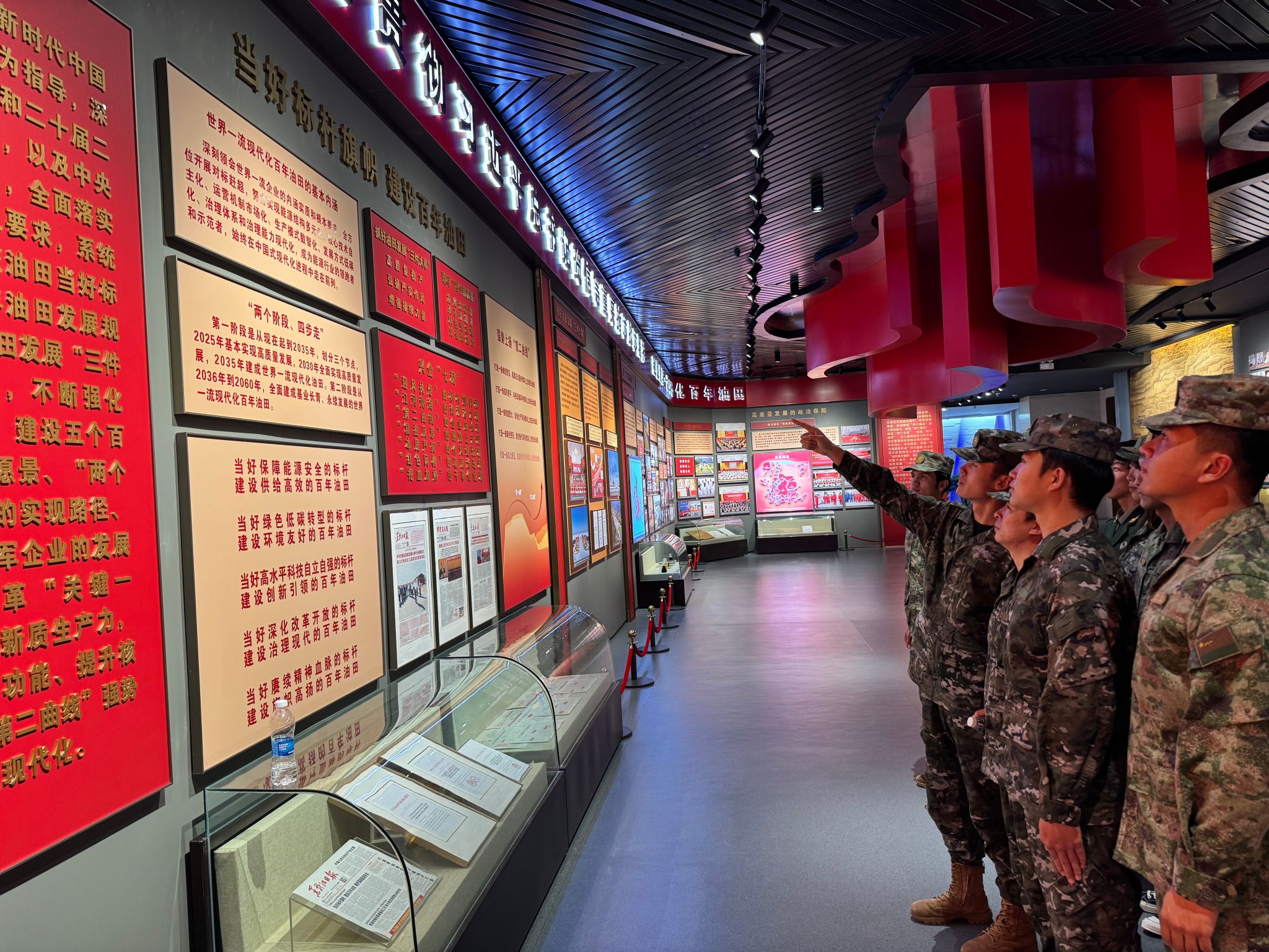 在大庆油田创业史展区,大家驻足于记录油田发展规划的展墙前交流讨论,感受石油开发的艰辛历程;在一幅幅反映创业初期的黑白照片前肃立凝望,仿佛重回奋斗岁月,感悟石油前辈“为国找油、无私奉献”的崇高境界,也在回望自身军旅初心中筑牢信仰根基。