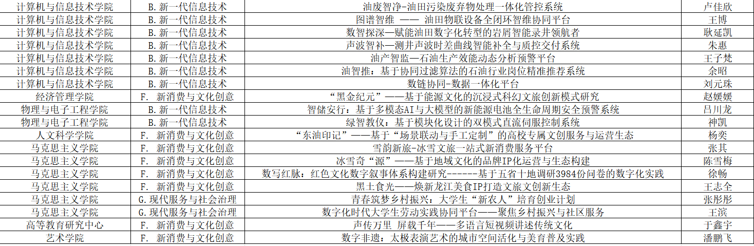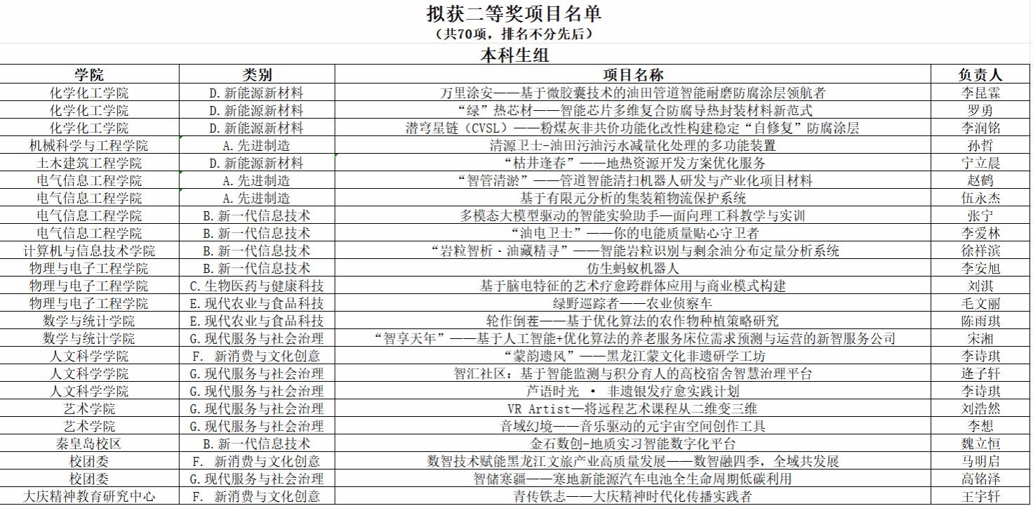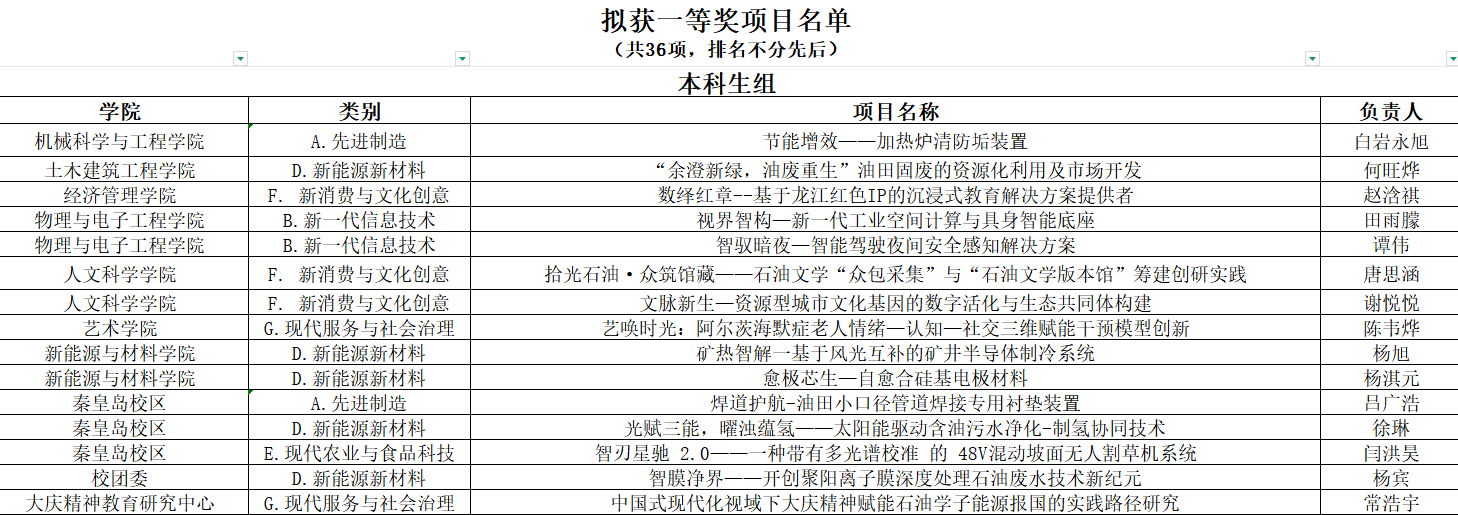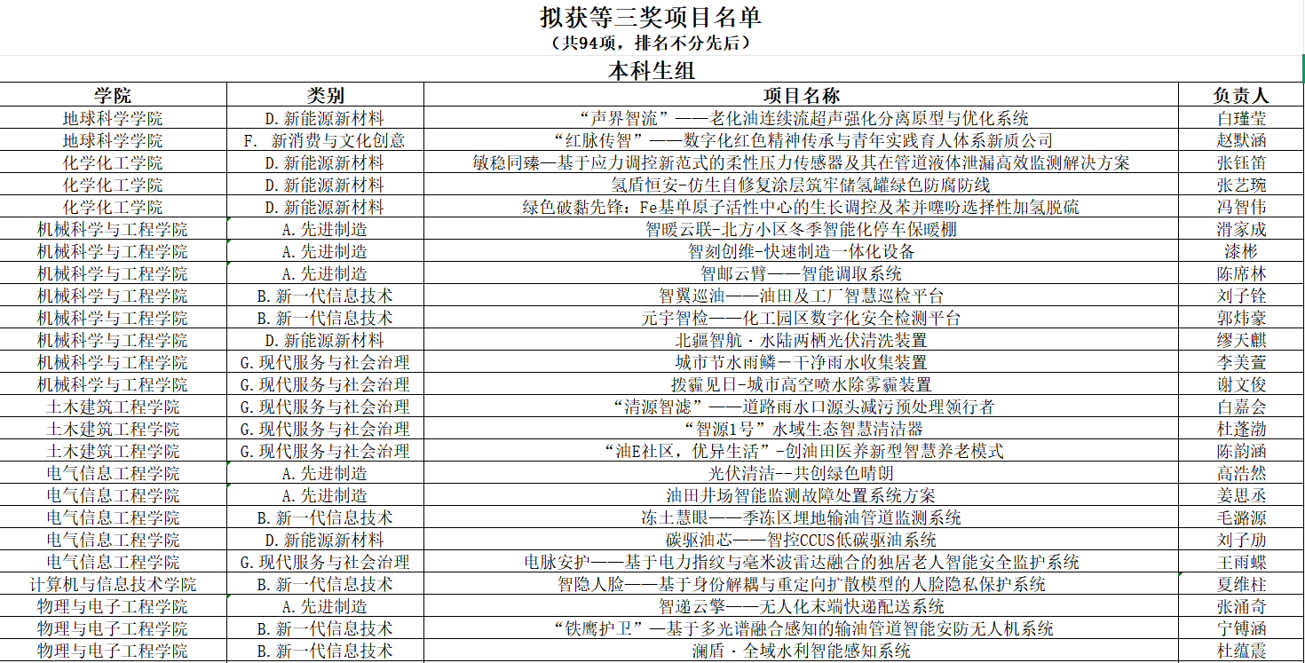 东北石油大学第二十届“挑战杯”大学生创业计划竞赛评审工作已结束,经评审委员会书面、现场评审,共评选出一等奖项目36项,二等奖项目70项,三等奖项目94项,现对评审结果进行公示。