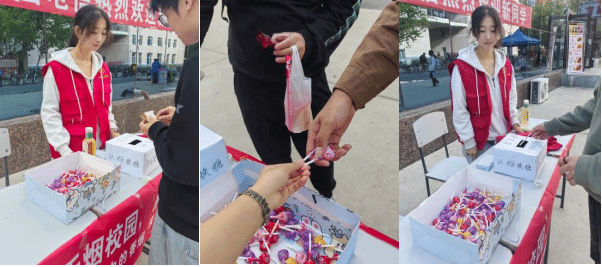 活动在三食堂前的指定兑换点正式启动,新颖的“以烟蒂换糖果”环节吸引了过往师生的注意。过往师生积极响应,主动将收集到的烟蒂投入专用回收袋,并换取一份代表健康祝愿的甜蜜糖果。这一“寓教于行”的设计,用温和而富有趣味的方式,引导学生摒弃公共场所随意弃置烟蒂的陋习,将维护校园环境内化为自觉行动。
