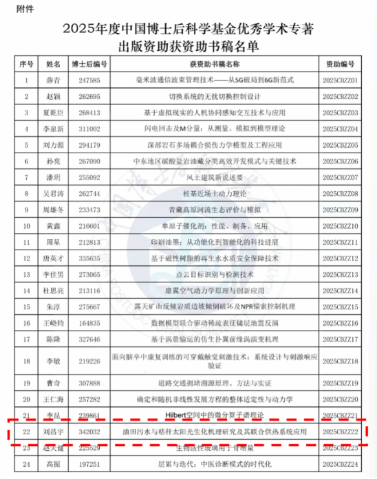 9月19日,中国博士后科学基金会发布,根据《中国博士后科学基金资助规定》和《中国博士后科学基金资助指南(2025年度)》,经专家评审、选题论证及公示,决定对24部书稿给予中国博士后科学基金优秀学术专著出版资助。我院建环系党支部书记、系主任刘昌宇教授的专著《油田污水与秸秆太阳光生化机理研究及其联合供热系统应用》获得资助,是本年度我校唯一获得资助的青年学者。刘昌宇作为校级培育“双带头人”教师党支部书记,在基层党组织活动创新立项课题的支持下,积极践行“党建+学科+科研”融合发展的新模式,发挥较好的示范带头作用。下一步将继续带领支部党员教师发挥业务优势,创造更多的高水平成果。