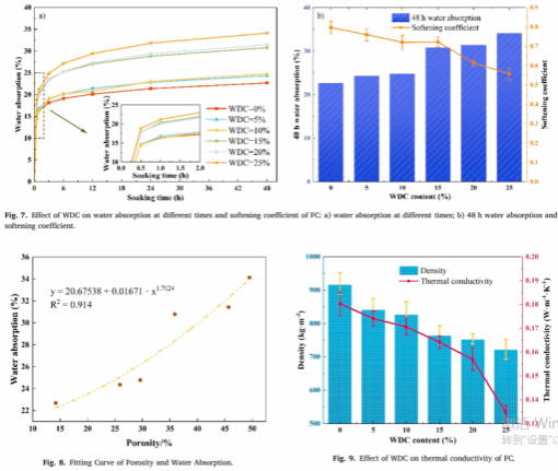 该项论文研究中将 WDC 与发泡水泥相结合,制成了含 WDC 的发泡水泥复合隔热材料。建立了多性能表征体系,使用 XRD 和 SEM 等分析了 WDC 掺量对发泡水泥抗压强度、吸水率和导热系数的影响。结果表明,在发泡水泥中加入 WDC 可有效降低材料干密度和导热系数,但强度降低,吸水率升高。试块在 20% 掺量时,各项性能达到了最佳平衡。研究定量揭示了孔隙结构与关键性能的关系,并从微观揭示了 WDC 恶化界面过渡区(ITZ)的机制。该研究成果为油田废弃物的高值化、低碳化利用提供理论支持。