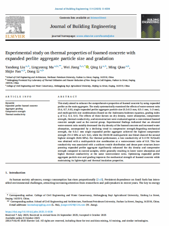 近日,我院寒区低碳材料与新型节能体系团队2023级在读硕士研究生刘艳东在国际权威期刊《Journal of Building Engineering》上发表题为“Experimental sludy on thermal propeties of foamed concrete with expanded perlite aggregate particle size and gradation”的研究论文,论文第一作者为硕士生刘艳东,我院寒区低碳材料与新型节能体系团队带头人马令勇教授、黑龙江八一农垦大学姜伟教授为通讯作者。本研究创新性地以具有保温性能的膨胀珍珠岩为骨料,系统考察了不同水灰比条件下,其单一粒径和多粒径组合对膨胀珍珠岩泡沫混凝土干密度、吸水率、抗压强度和导热系数等关键性能的影响,并结合微观结构分析深入阐明其作用机制。