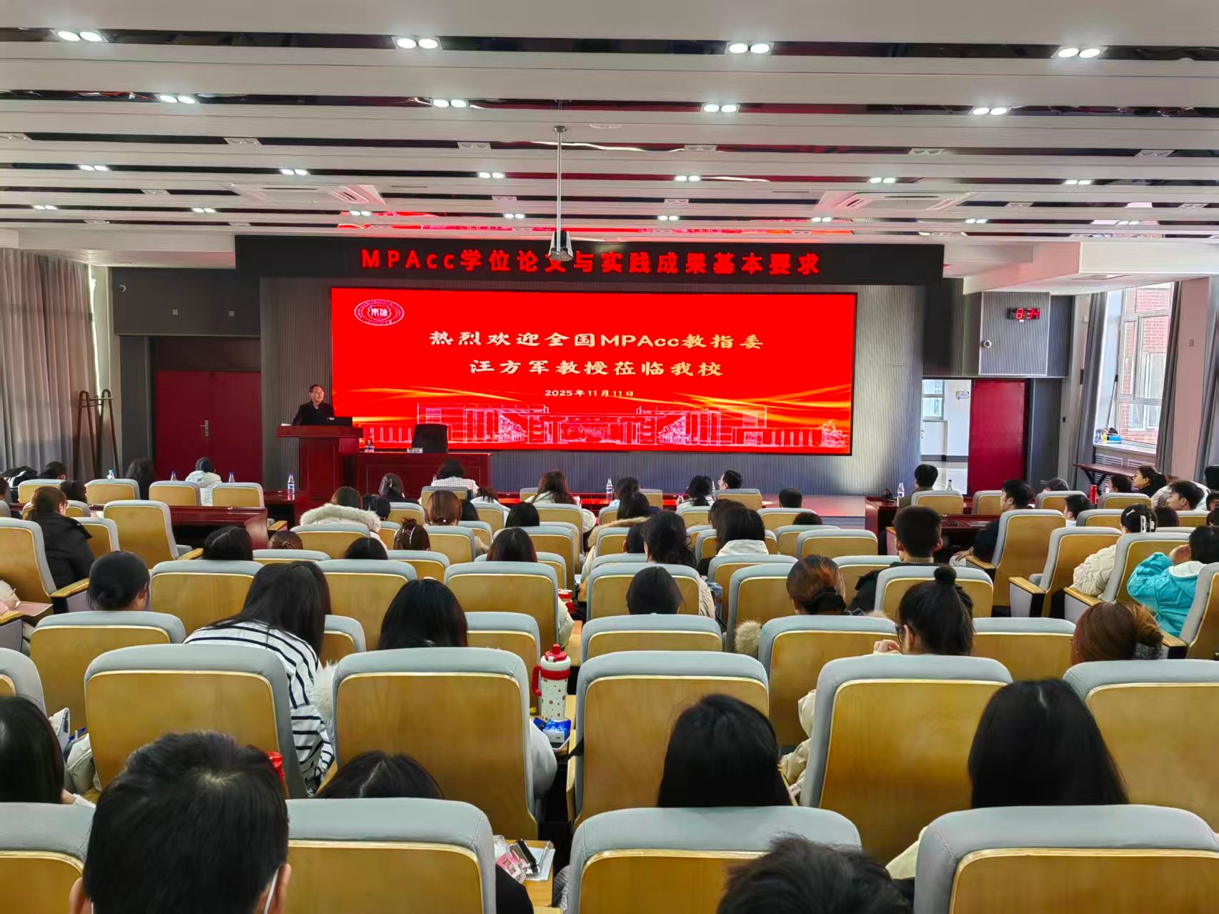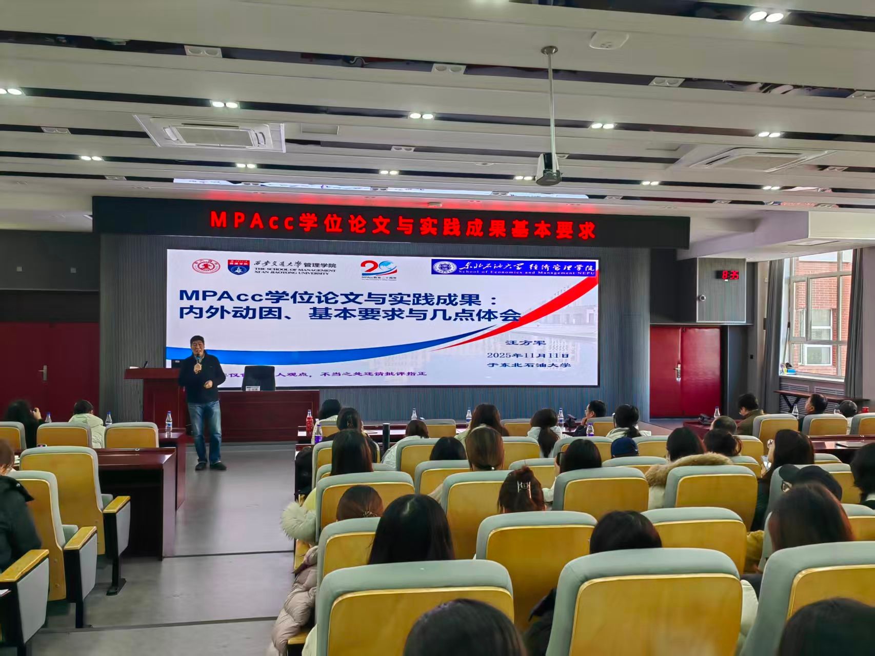 为提高我院MPAcc学位论文质量,2025年11月11日,经济管理学院在第一教学楼H座211会议室,特邀全国MPAcc教育指导委员会委员、西安交通大学汪方军教授开展了主题为《MPAcc学位论文与实践成果基本要求》的专题讲座。经济管理学院院长王艳秋及学院百余名师生参会。讲座由专业硕士(MBA/MPAcc)教育中心主任王赵亮主持。