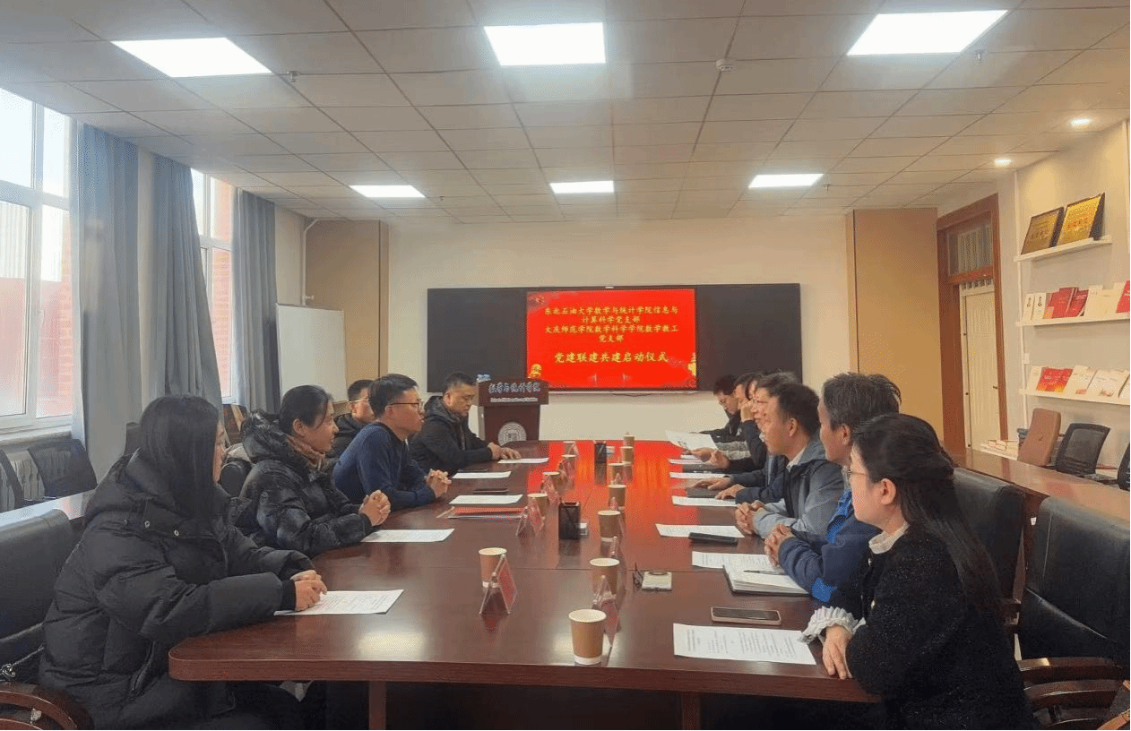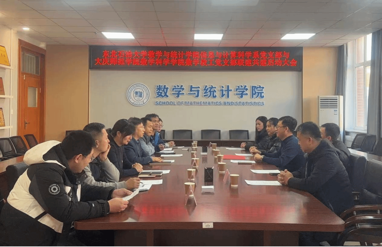 11月25日上午,东北石油大学数学与统计学院信息与计算科学系党支部与大庆师范学院数学科学学院教工党支部在东北石油大学第一教学楼1B325召开党建联建共建会议。东北石油大学数学与统计学院党委书记杨云峰,院长郭立丰,副书记王继红,副院长宋国亮,党支部书记高伟,大庆师范学院数学科学学院党总支书记、院长高扬,副院长乔兴,副院长沙元霞,数学教工党支部书记金天坤,党支部副书记万家乐,以及相关支部党员参加活动。会议由东北石油大学数学与统计学院党委书记杨云峰主持。
