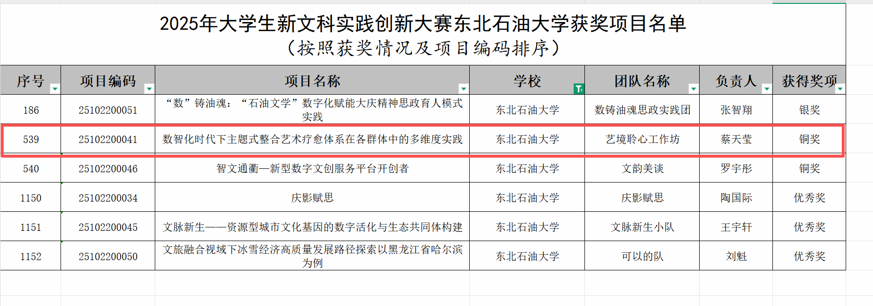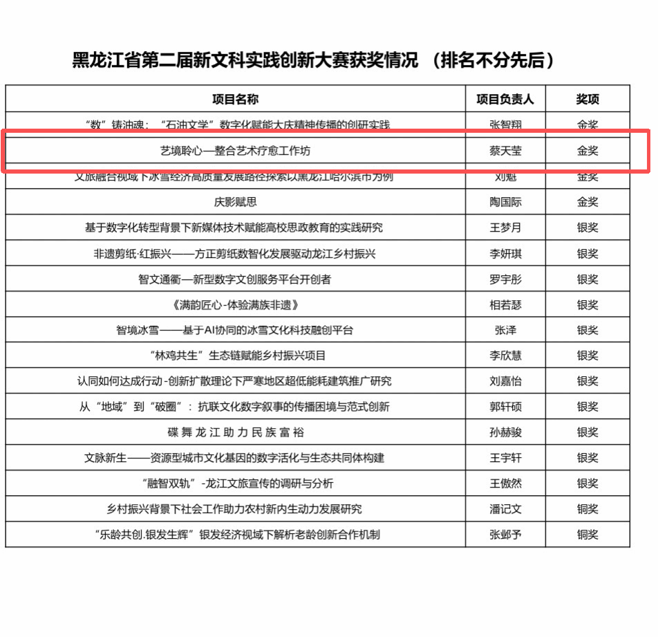 近日,第二届全国大学生新文科实践创新大赛传来捷报,由艺术学院闫红、盖广胜、张潇月老师指导的艺境聆心-整合艺术疗愈工作坊项目组参赛作品《数智化时代下主题式整合艺术疗愈体系在各群体中的多维度实践》,在全国433所高校、超2.5万项参赛项目、16万余名参赛学生的激烈角逐中脱颖而出,历经多轮评审层层筛选,最终斩获省级金奖、国家级铜奖的优异成绩。