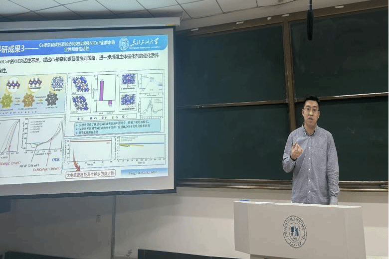 来自不同学院的三位学生代表带来各具特色的分享:土木建筑工程学院的张家浩系统梳理创新实践项目从立项到结项的全流程,重点解析科研计划设计、校企合作实践及成果转化路径;经济管理学院的范硕以论文写作为切入点,从选题思路、研究方法到投稿流程,分享论文撰写与修改的实用技巧,助力同学们提升论文质量;化学化工学院的苏建聚焦高效水电解方向,阐述新型电催化剂的设计思路与应用前景,其相关成果已发表高水平论文并申请专利。