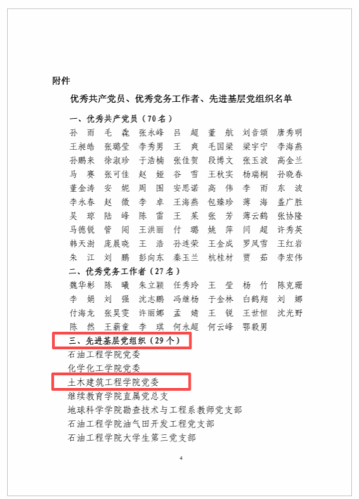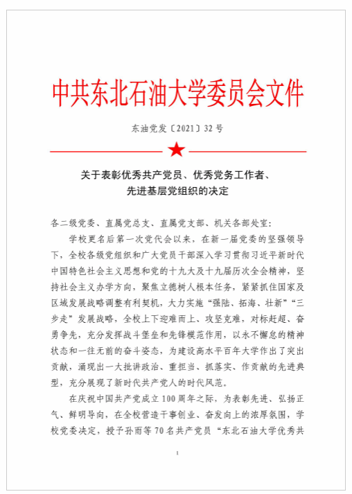 1. “党建+”工程成果显著。学院党委和4个党支部获“校先进基层党组织”,1个支部入选首批“省高校双带头人教师党支部书记工作室”、省级“强国行”团队,2个支部获学校“双点”建设或“双带头人”培育单位,1人获龙江最美辅导员,1人获石油教育学会“首届辅导员素质能力大赛”二等奖。