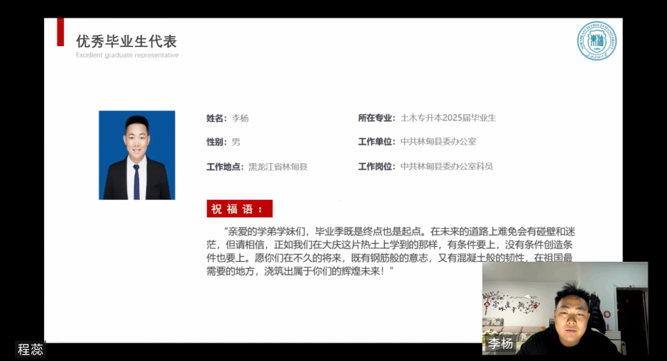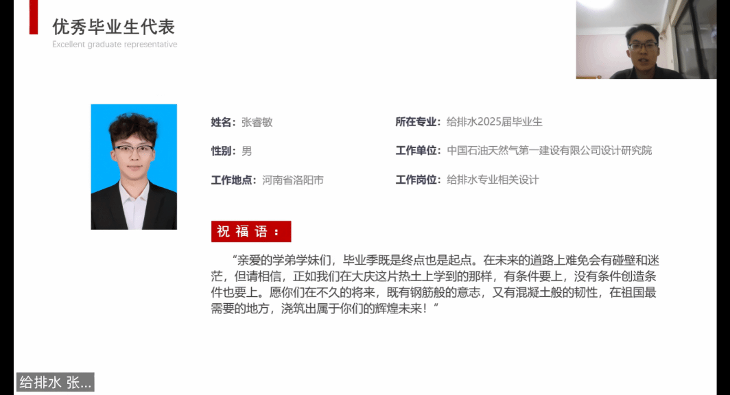 经验分享环节,两位2025届优秀毕业生代表结合自身经历,分享求职经验与职场感悟。土木专升本毕业生李杨,目前任职中共林甸县委办公室科员,他以“有条件要上,没有条件创造条件也要上”的大庆精神勉励学弟学妹,祝愿大家以“钢筋般的意志、混凝土般的韧性”浇筑未来之路。给排水专业毕业生张睿敏,现就职于中国石油天然气第一建设有限公司设计研究院,他用“路虽远,行则将至”鼓励在线同学,要坚持攻坚克难,在求职与工作中化“不可能”为“可能”。