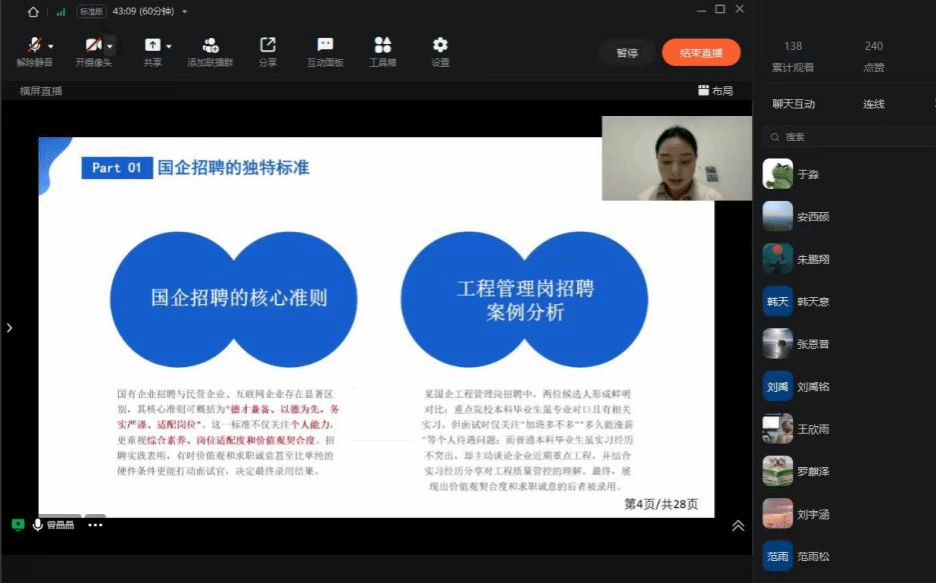 中核第五建设有限公司曾经理则聚焦国企招聘核心逻辑,提出“德才兼备、以德为先”的选人标准。她指出,简历因学历、专业不符被筛,面试重点考察综合素质与价值观契合度。建议学生提前研究企业背景,打磨1至2分钟结构化自我介绍,避免流水账;答题采用“总—分—总”逻辑,结合实习案例;注重细节着装得体、准时守时、面试后握手致谢,都是加分项。她特别提醒:“国企看重稳定,少问薪资涨幅,多问成长路径。”