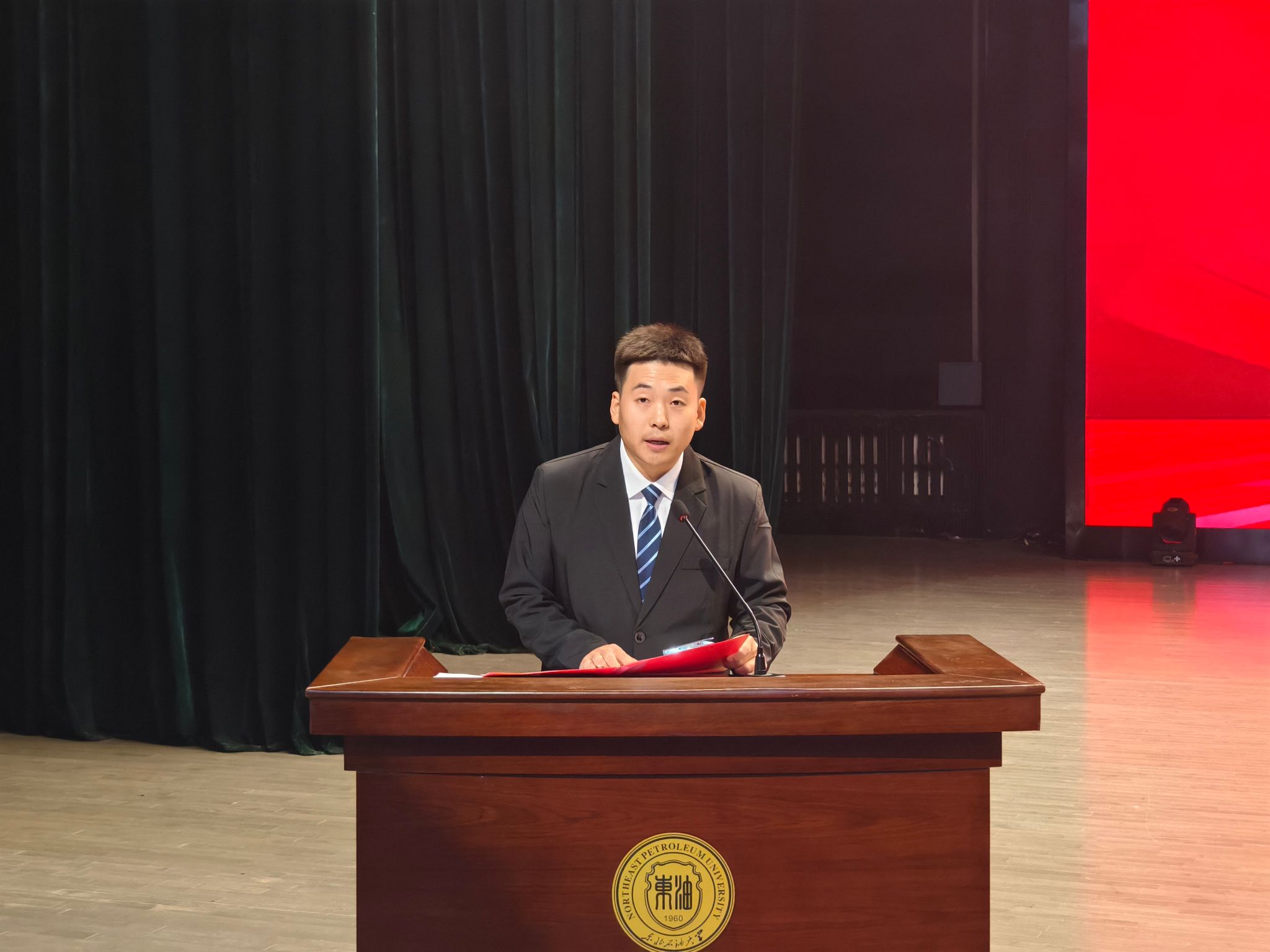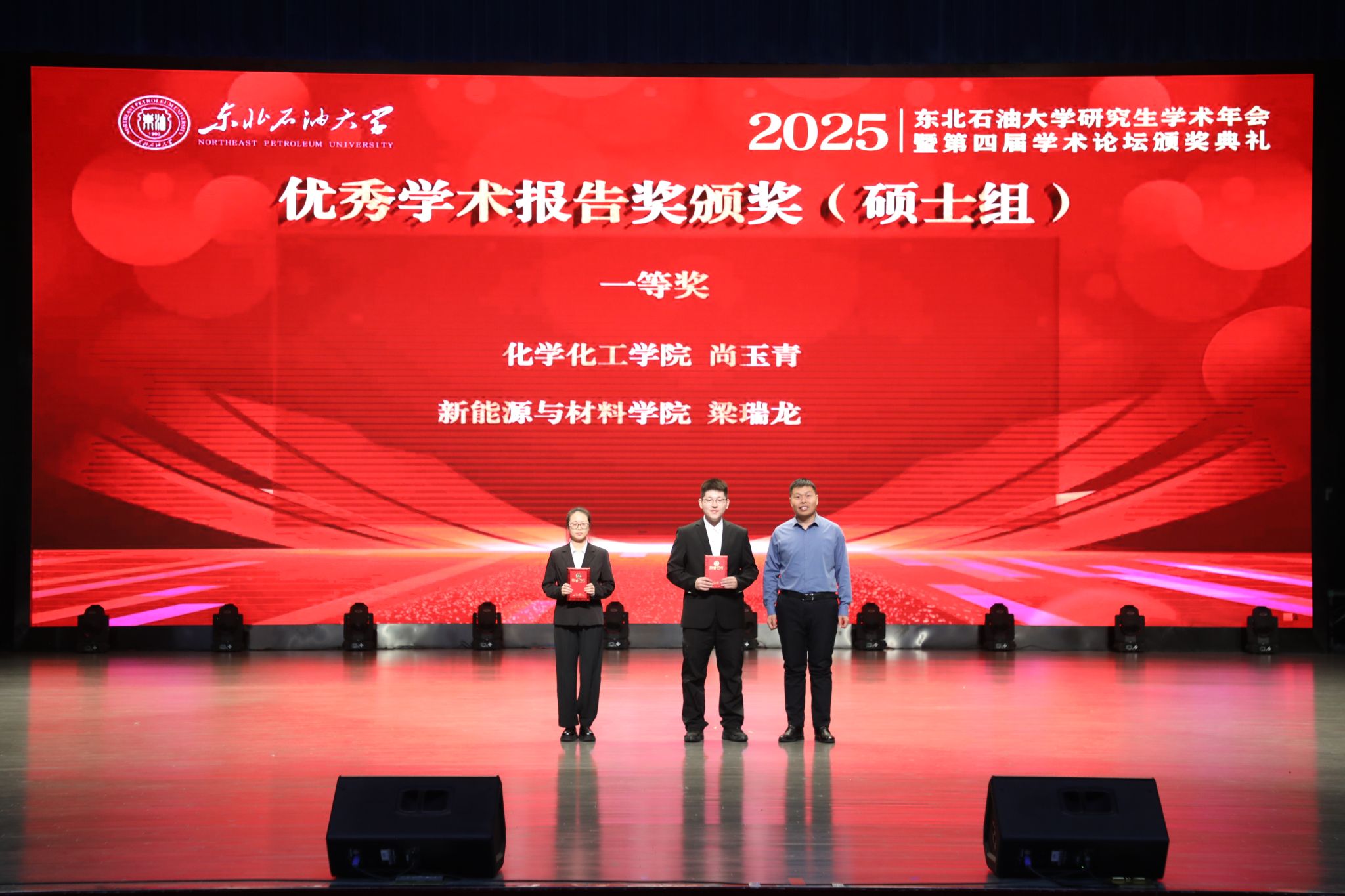 专业实践杰出奖获奖代表、石油工程学院硕士研究生牛赵钱,优秀学术报告奖获奖代表、新能源与材料学院博士研究生乔志强在闭幕式上作经验分享。