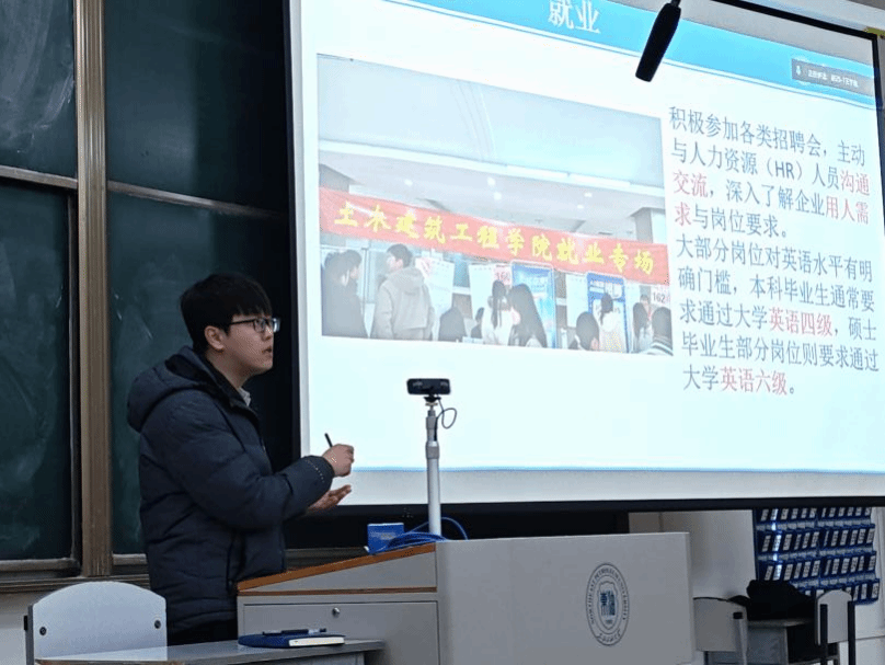 辅导员樊铮围绕评奖评优、学科竞赛和就业工作进行了说明。他详细讲解研究生综合测评管理办法、研究生人才库统计等相关工作安排,鼓励同学们积极参加“挑战杯”等高水平学科竞赛,不断提升专业能力和综合素养。针对当前就业形势,他结合招聘市场变化,分析了用人单位需求趋势,建议低年级研究生尽早明确职业发展方向、加强能力储备,高年级研究生积极把握春季招聘关键期,科学选择就业地域和岗位,不断提升求职竞争力。