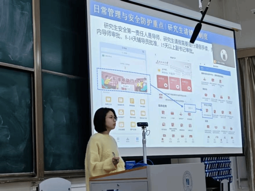 辅导员杨瑞桐围绕网络安全、宿舍安全、工作室安全等方面进行了专题教育。结合典型案例,她详细讲解了账号使用、设备防护、宿舍管理和工作室用电等注意事项,强调研究生要严格遵守学校和学院相关管理规定,坚决杜绝宿舍吸烟、使用违规电器等行为,做到警钟长鸣、防微杜渐。她还对企业微信请销假流程进行了说明,并对班级宿舍安全自查和周报报送工作提出具体要求。