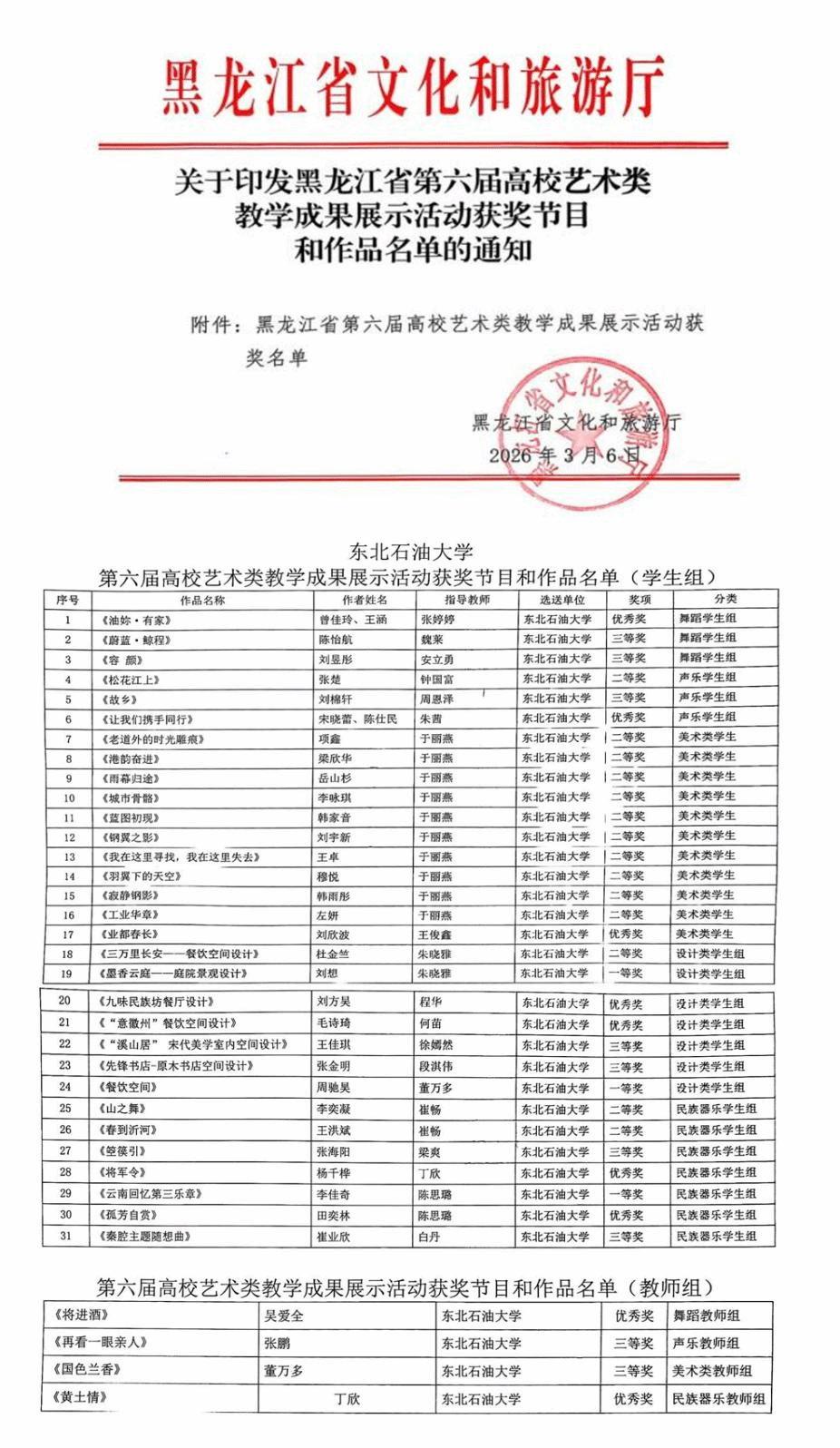 近日,黑龙江省第六届高校艺术类教学成果展示活动获奖名单正式揭晓,我校师生凭借扎实的专业功底与出色的创作能力脱颖而出,斩获35项大奖,其中教师组4项、学生组31项。本次活动由黑龙江省文化和旅游厅主办,全省42所高校同台竞技,共报送师生作品2828件,经多轮评审最终1389件作品脱颖而出,赛事含金量与竞争激烈程度均创历届新高。
