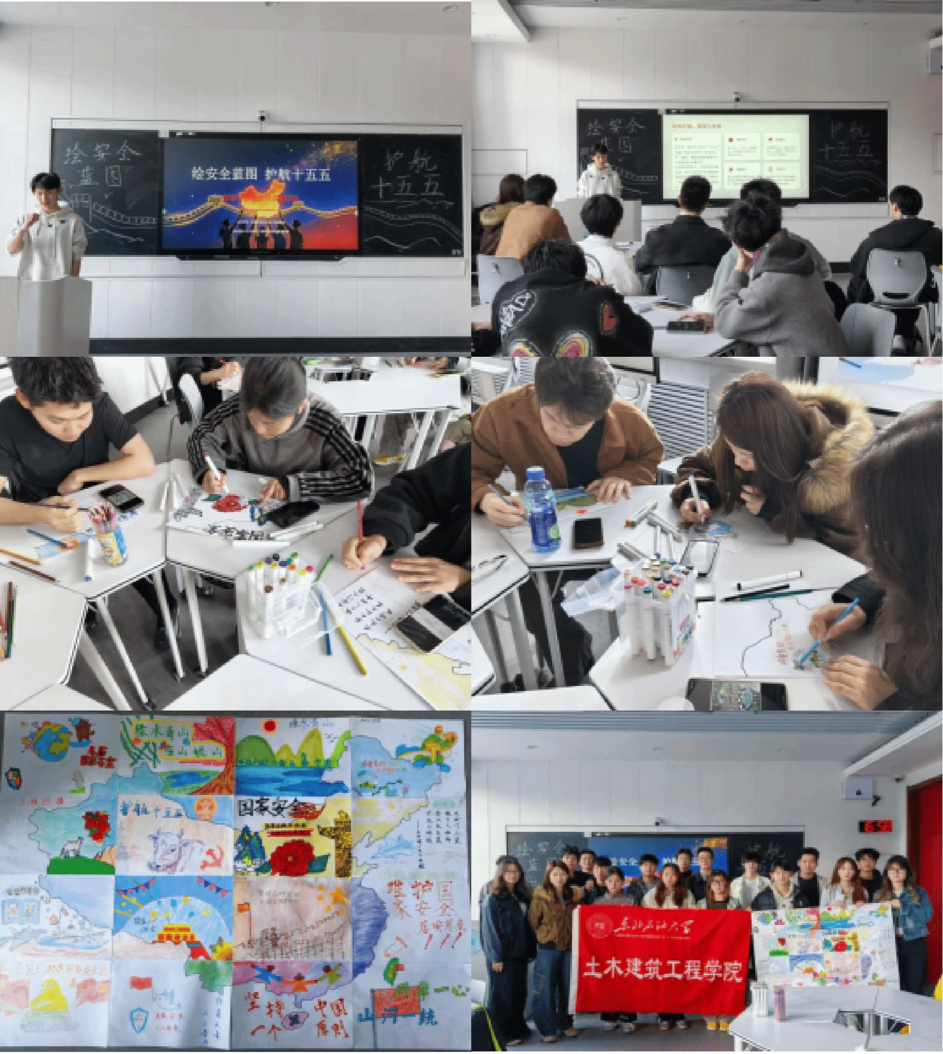 “绘”聚安全共识,拼接蓝图涵养家国情怀。 4月15日,“绘安全蓝图,护航‘十五五’”主题教育活动在1H208教室举行。活动通过专题宣讲阐释“十五五”规划与总体国家安全观核心要义,同学们以画笔为媒,绘制中国地图局部画作,现场拼接成一幅融合高铁纵横、航天逐梦、国防力量等元素的“安全中国”主题长卷。活动以“宣讲+创作+拼接”互动形式,实现理论学习与艺术实践有机融合,进一步凝聚起维护国家安全的思想自觉。