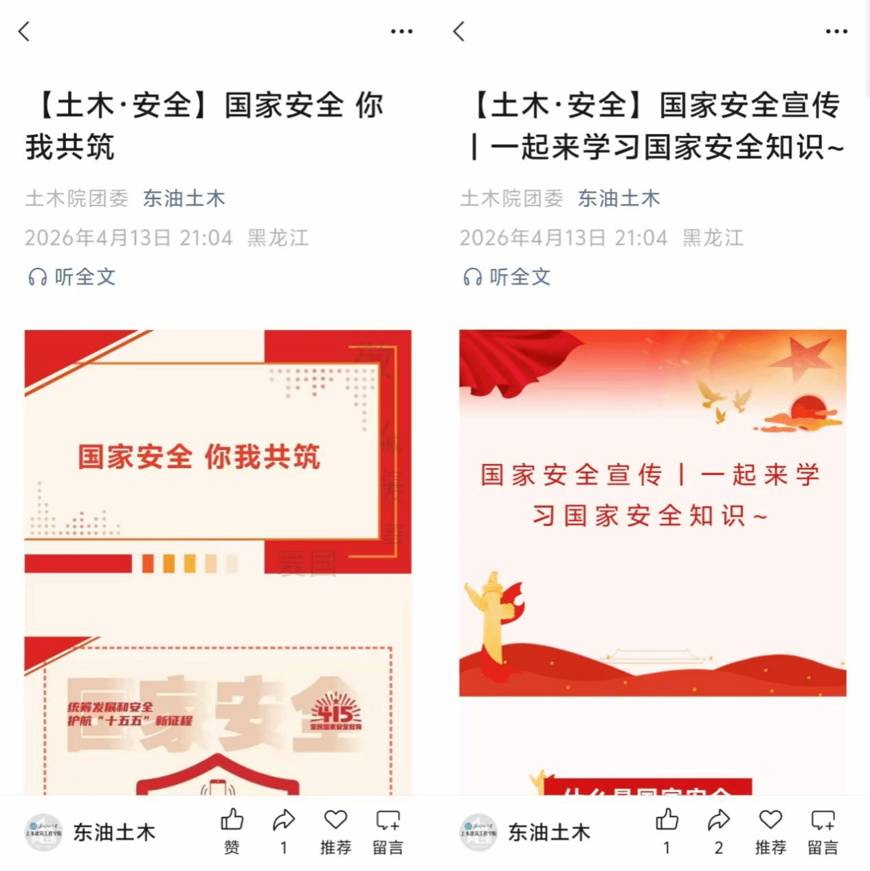 融媒同频共振,线上矩阵营造浓厚氛围。依托“东油土木”微信公众号,学院及时发布国家安全教育主题推文2篇,以图文并茂形式解读总体国家安全观,宣传安全防范知识,拓展教育覆盖面和影响力,营造出全员共筑国家安全屏障的良好网络氛围。