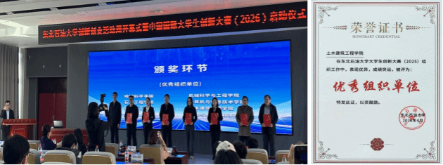 为落实立德树人根本任务,推动创新创业教育发展,我校于2026年4月8日至12日开展创新创业主题活动周。开幕式上,我院被授予“优秀组织单位”荣誉称号并获颁证书。